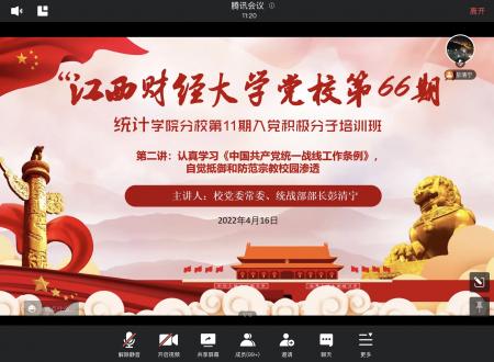 4月16日下午,统计18禁直播通过腾讯会议第11期入党积极分子培训班第二讲党课开讲,校党委常委、统战部部长彭清宁为全体学员作题为“认真学习《中国共产党统一战线工作条例》、自觉抵御和防范宗教校园渗透”的辅导报告。
