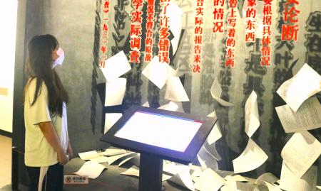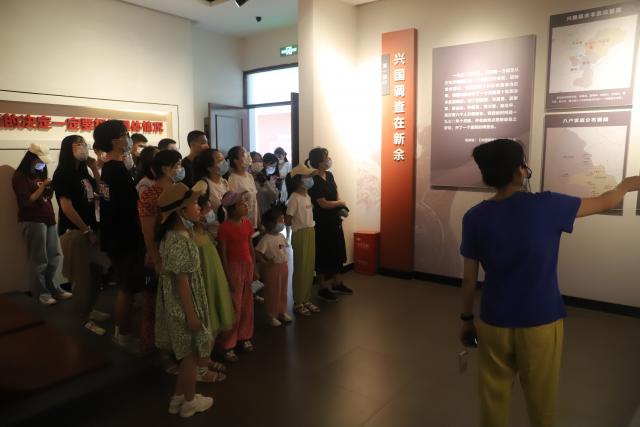 图为江西18禁直播 统计18禁直播学子们在兴国调查陈列室听讲解员介绍历史故事。