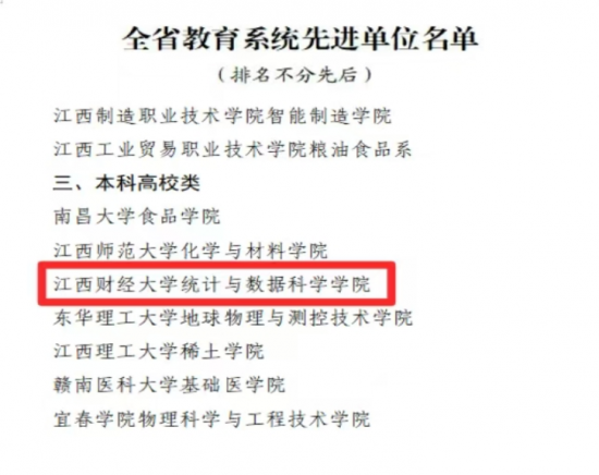此次获评全省教育系统先进单位,既是对统计与数据科学学院过往成绩的认可,更是未来前行的动力。统计与数据科学学院将锚定建设世界一流统计学科奋斗目标,为教育强省、教育强国建设贡献更多力量!