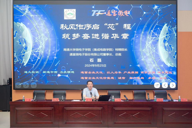 通富微电董事长兼总裁、学院特聘院长石磊发表讲话并为新生作入学讲座。石磊院长结合行业发展趋势与自身实践经验,强调了微电子产业在国家发展战略中的重要性,并鼓励同学们紧跟时代步伐,努力成为未来半导体行业的领军人才。他在开学第一课中强调三个方面:一是传承大国工匠精神,铸就时代辉煌。要继承和发扬大国工匠精神,不断提升自己的专业技能与素养;二是聚焦半导体研究,把握科技核心。同学们要勇于在半导体领域探索前行,为国家的科技自立自强贡献力量。三是坚持科技创新,引领未来发展。要紧跟时代步伐,勇攀科技高峰,不断突破自我,实现个人价值与社会价值的统一。