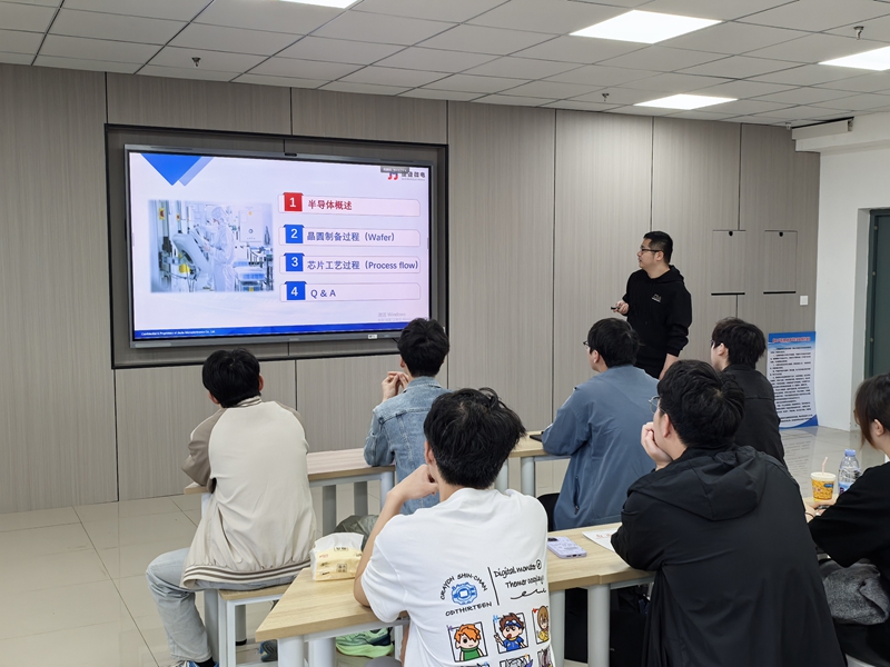 沈部长以捷捷微电先进工艺生产线为背景,以芯片制造全流程为主线,结合自身丰富的功率器件工艺制备经验,系统讲解了光刻、刻蚀、薄膜沉积、离子注入、芯片测试等关键工艺的技术、原理及实际应用。他还结合当前半导体行业的发展趋势,分享了先进制程技术以及国产芯片自主创新的最新进展。通过此次授课,不仅充分调动了学生对集成电路工艺的兴趣以及投身国产集成电路产业的热情,还为人才培养模式改革提供了一定的经验。(葛梅)