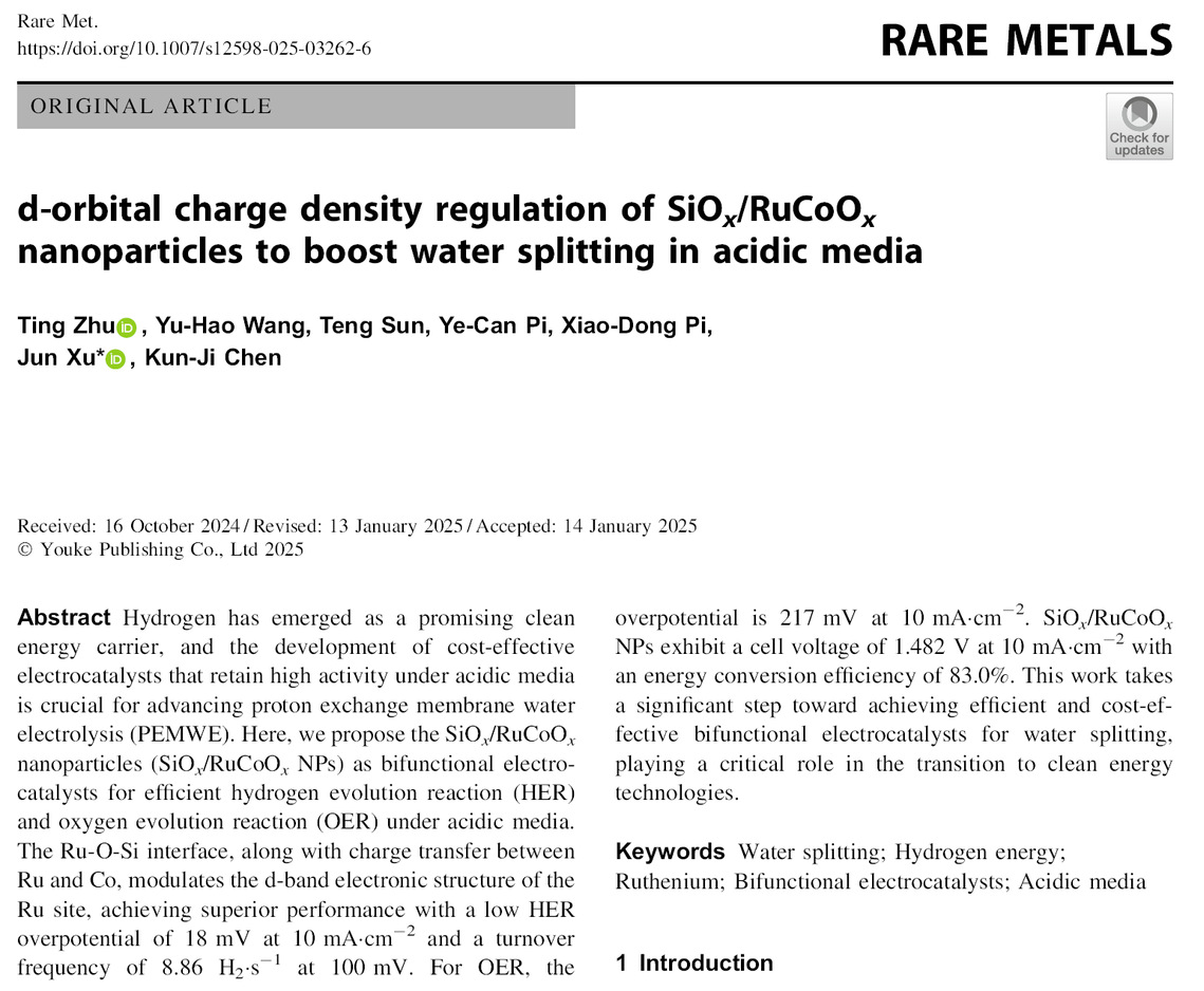 近日,18禁直播 徐骏教授团队的朱挺博士在Rare Metals上发表了题为“d-Orbital Charge Density Regulation of SiOx/RuCoOx Nanoparticles to Boost Water Splitting in Acidic Media”的研究文章。朱挺为论文第一作者,徐骏为通讯作者,18禁直播 18禁直播 为第一单位。