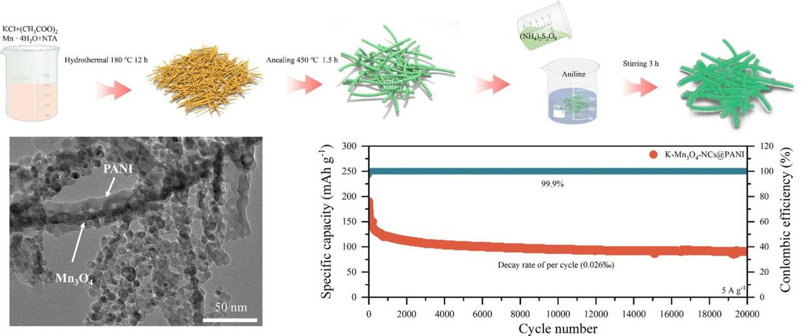 锌离子电池(Aqueous Zinc-ion Batteries, AZIBs)因其安全性高、资源丰富、成本低廉和环保性好,近年来成为新一代储能体系的重要研究方向。然而,其关键部件——正极材料仍面临导电性差、离子扩散慢和循环稳定性不足等挑战。尹海宏团队提出了一种兼具离子掺杂、纳米链结构设计和导电聚合物包覆的综合策略,成功制备出具有一维链状结构的K+掺杂Mn3O4纳米链(K-Mn3O4-NCs)并包覆聚苯胺(PANI)形成K-Mn3O4-NCs@PANI复合正极材料。