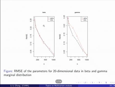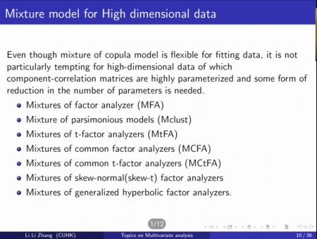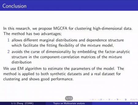 随后,张莉莉博士讲解用于如何基于Copula因子混合模型对高维数据进行聚类。考虑到在现实生活中,高维数据的聚类分析存在如下挑战:(1)各分量的边际分布可能并不遵循单一分布,且相互间的相关关系可能遵循不同模式,(2)数据维数过高,在具体聚类前需要先进行降维处理。针对问题(1),Copula函数是用于刻画此类相关关系模式的重要统计工具,而对于(2),现有的因子分析模型可有效用于高维数据的降维处理。有鉴于此,张莉莉博士重点介绍如何结合使用Copula和因子分析模型来进行高维数据的聚类分析,并与混合因子分析仪(MFA)、简约模型的混合(Mclust)、共因子分析仪(MCFA)等混合模型进行对比。